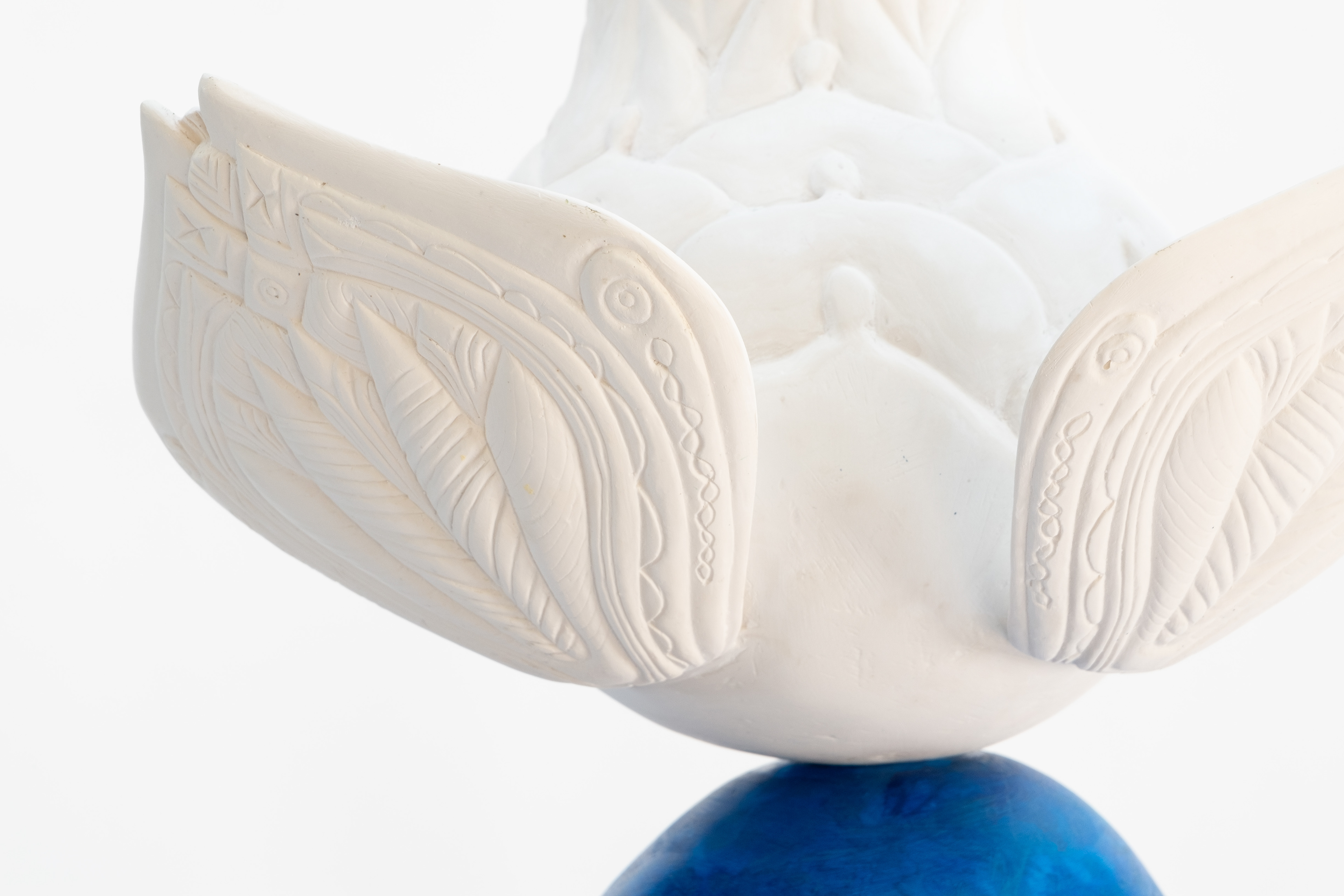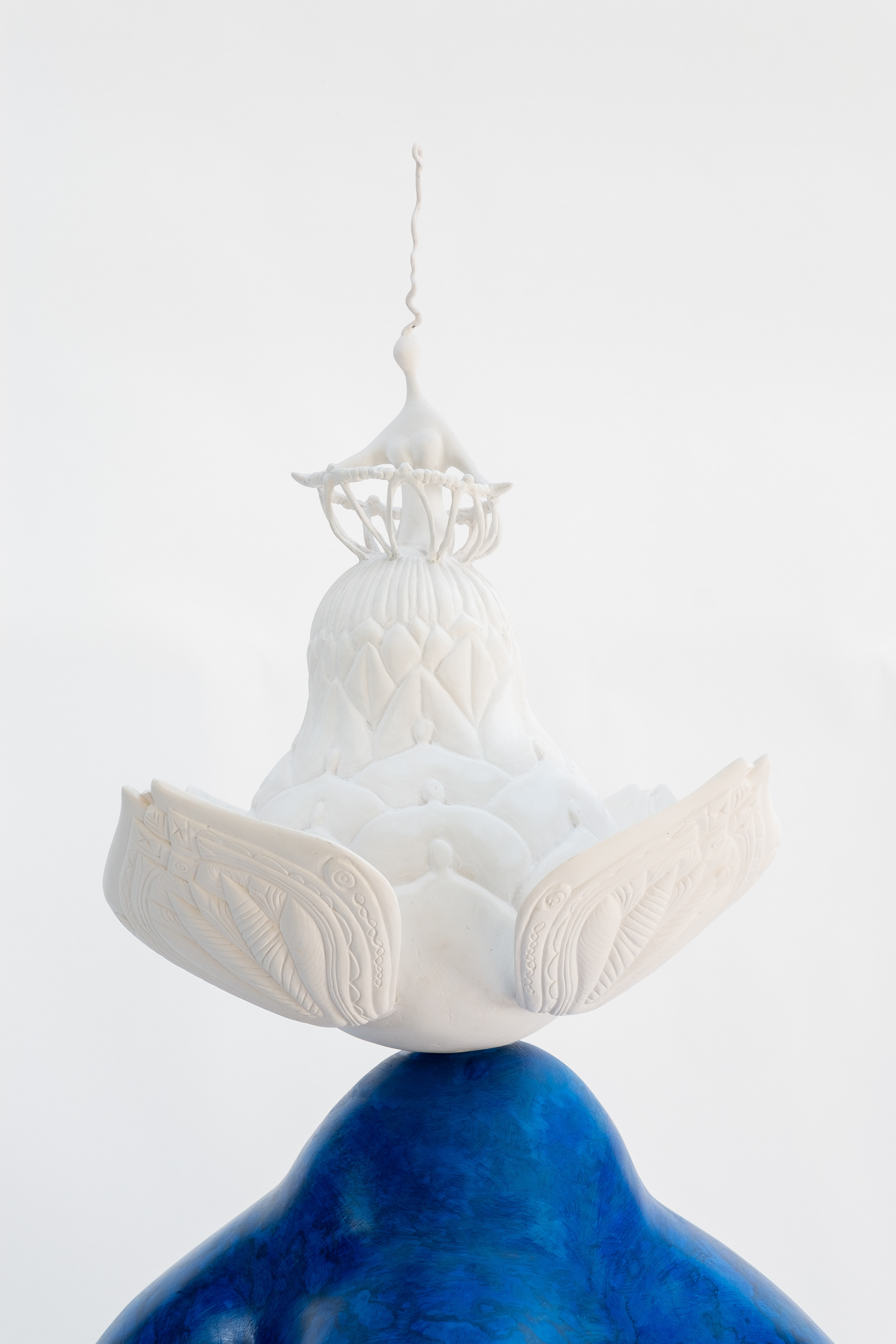 My tripod sculptures mostly exceed human height; they have a soft, light-reflecting texture, and laconic forms are intertwined with technically complex representations.